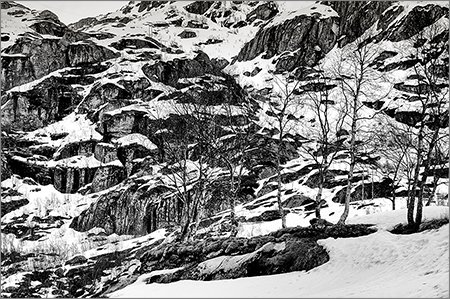 - Een mooi uitzicht op de bergen in Noorwegen. De foto was in zwart-wit. Misschien rechts een stukje weglaten om de mooie rotspartijen links meer te doen uitkomen. Belichting: 1/30 Diafragma: 7.1 Brandpuntafstand: 58 mm ISO: 100