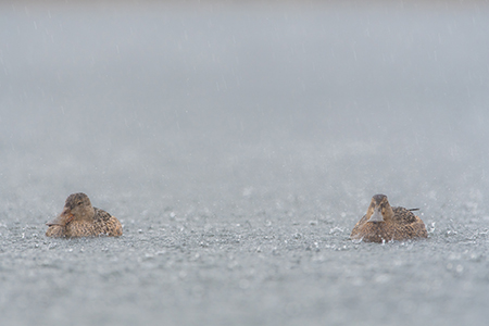 - Triest kijkende Slobeenden. Ja triest word je van de regen zo ook keken deze eenden. Een mooi laag standpund en scherpte diepte. Misschien ook bij deze foto de bovenkant iets donkerder maken.
