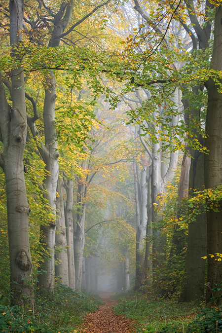 Mooie doorkijk in de mist en de overhangende takken van de bomen.