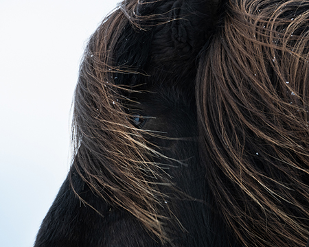 Een mooie uitsnede. Prachtig de haren van de paard en de sneeuwvlokken maken het af.