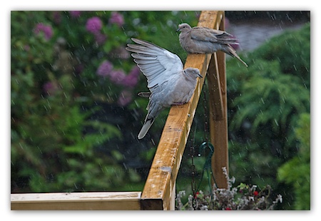 - 2 torteltjes tijdens een regenbui op een pergola,gefotografeerd vanuit een raam van het huis. dezelfde torteltjes na die regenbui in een zonnetje,mooi licht,balkje onderaan weg snijden,heeft geen meerwaarde.