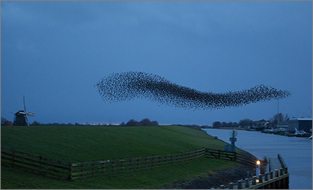 - Spreeuwenwolk, Workum in Friesland. Otte heeft links de karakteristieke molen in het beeld gelaten. Het was al behoorlijk laat en daarom is gekozen voor een hoge iso-waarde (ergens tussen 2000 en 3000 iso). Er is geen statief gebruikt. Het was snel handelen. Het landschap niet optimaal scherp, maar dat maakt het beeld er niet minder fraai door. Mooie sfeer.